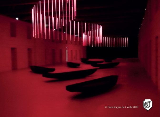 Installation contemporaine de Claude Lévêque : « Dans le grand dortoir, l’apparition d’un phénomène lumineux cosmique dévoile les sensations que la Loire me procure depuis toujours. Un dispositif nocturne visuel et sonore qui invite au songe ».