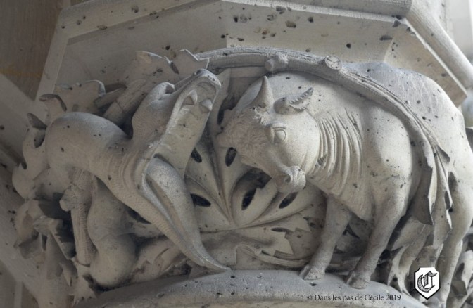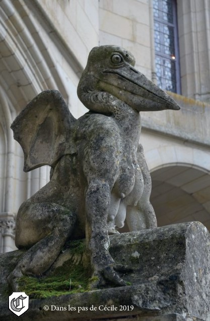 La visite commence sous le long portique agrémenté de sculptures représentant des corps de métier, des chimères, ainsi que des épisodes illustrant « Le Roman de Renart ».