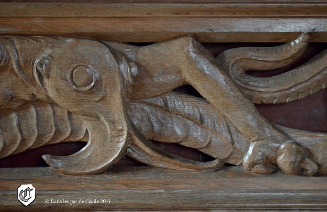 Cette partie de la visite nous permet de traverser plusieurs espaces : le salon de réception, le cabinet de travail, la chambre du seigneur et la salle des Preuses. Dès son arrivée dans le salon de réception, Elicec est fascinée par les décors reconstitués très colorés ainsi que par les boiseries. Il y en a une d’ailleurs qui lui rappelle un personnage un peu effrayant sortie tout droit du livre que sa guide-conférencière est en train de lire.