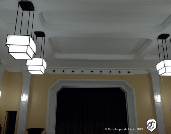 Vous voici dans la salle qui au départ a été réalisée pour accueillir un cinéma. Avant la restauration, elle servait également de salle de réunion. Son décor Art Déco avait été remplacé par une moquette du sol au plafond.