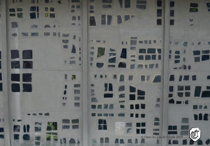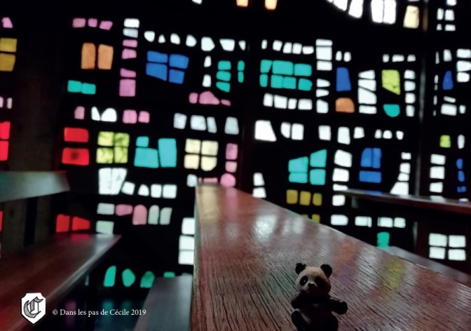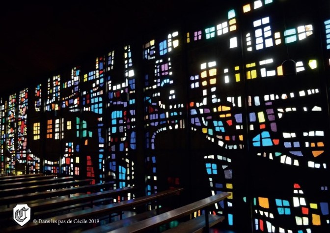 La chapelle est simple, modeste et sobre. Pas de vitraux comme les apprécient particulièrement sa guide, mais des dalles de béton serties de blocs de verre colorés, œuvre de Manessiez. Une référence est d’ailleurs faite aux arbres qui se trouvent sur le bord de la route. Avez-vous aperçu les arbres ?
