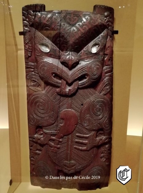 En plus de cette architecture, le décor est présent à l’extérieur et à l’intérieur des édifices maoris. Les éléments sculptés comme ce « poupou » sont confectionnés par les femmes. Les « poupou » représentent des ancêtres spécifiques, qui sont identifiables aux tatouages et autres attributs que peuvent être les armes. Ici nous retrouvons les tatouages avec les spirales présentes sur tout le corps ainsi que de la nacre d’haliotis pour les yeux.