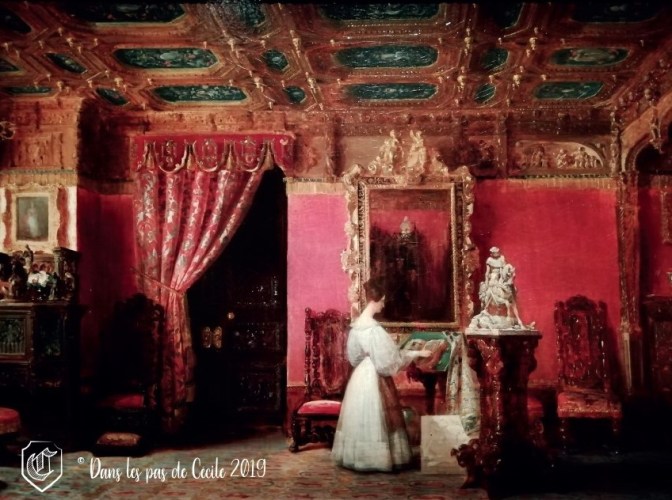 … et voici une peinture représentant le salon de Marie d’Orléans, peint par Prosper Lafaye. On peut ainsi la voir en train de feuilleter un livre d’heures posé sur un pupitre gothique, sans oublier le socle qui se trouve au milieu du salon représentant des dragons, des anges et des démons.
