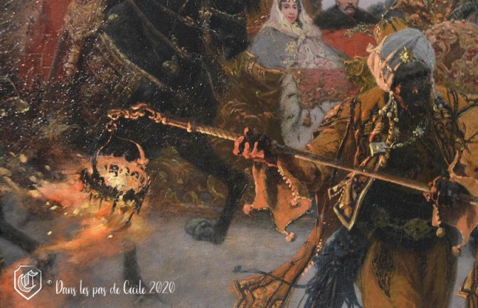 L’âge d’or du pays inspire les artistes, qu’ils soient peintres, auteurs ou compositeurs. Et cela en résulte de magnifiques tableaux, tout en nuances et lumière. Elicec a eu un véritable coup de cœur dans l’exposition, il s’agit du tableau représentant « Le départ du palais de Wilanów du roi Jean III Sobieski et de Marie-Casimire, son épouse » de Józef Brandt.