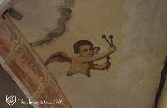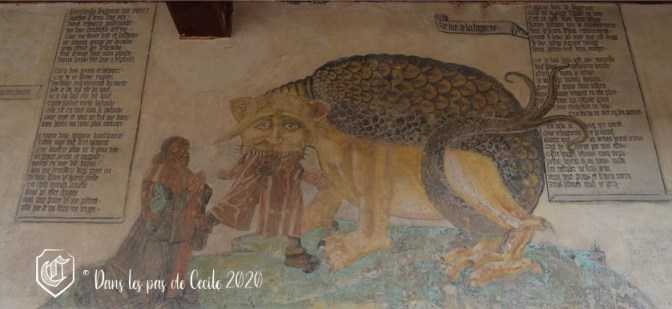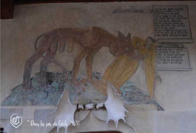 Le portique d’entrée est connu pour ses fresques restées à l’air libre depuis leur réalisation, mais surtout pour le côté humoristique de Rigault d’Aureille qui en est le commanditaire. Voyez par vous-même : la première fresque représente une Bigorne replète, qui est monstre hybride dévorant les hommes gouvernés par leurs épouses… tandis que la deuxième représente une Chicheface squelettique, dévorant les femmes soumises à leurs maris 😊
