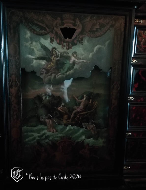 Continuons la visite et découvrons toujours plus de choses étonnantes : comme le cabinet flamand avec une horloge encastrée sur le panneau frontal, possédant une particularité. Il représente Neptune sur les flots, et grâce à la technique celui-ci vogue sur les vagues en mouvement, sûrement devant les yeux ébahis des convives assistant au phénomène !