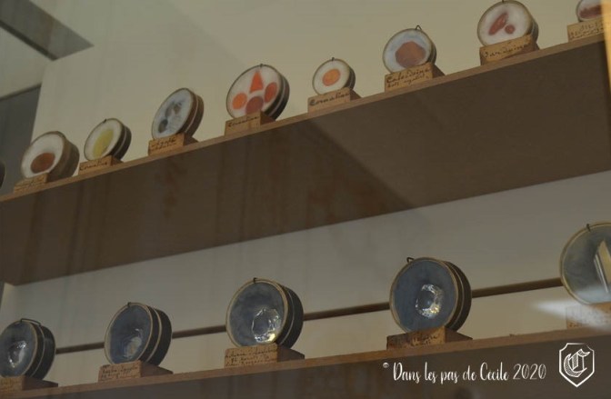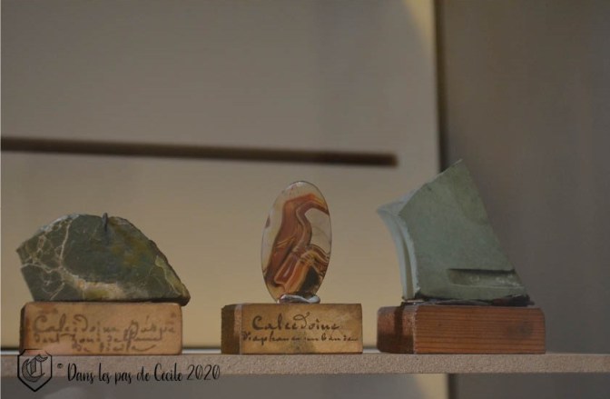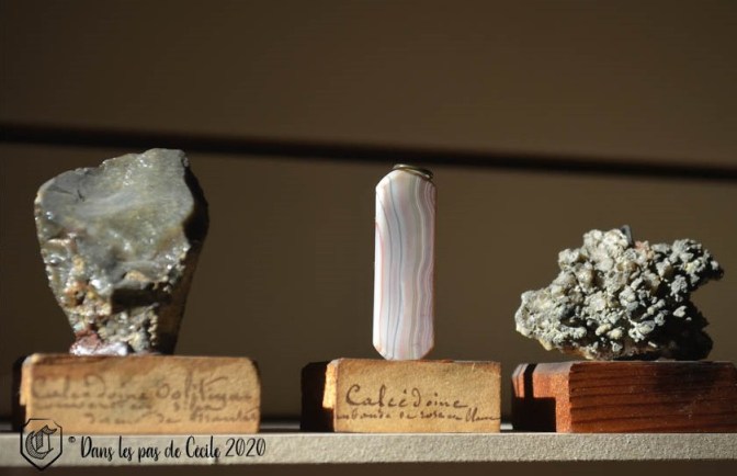 Viens ensuite la salle des minéraux. Thème qui a déjà eu le droit à une exposition il n’y a pas si longtemps au musée. Exposition qui mettait en valeur la collection d’Henri Dupuis tout en mettant en parallèle un collectionneur privé. Dans la pièce, des photographies des étagères dans le musée Dupuis accompagnent la présentation : d’un côté les minéraux dits ferreux, avec également ce que nous appelons les gemmes, une vitrine comportant les agates ainsi qu’une malachite, et enfin une vitrine dédiée aux calcédoines. Cette dernière étant particulièrement appréciable en journée avec la lumière du soleil jouant les aspects nacrés de certains des minéraux présentés.