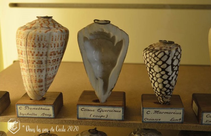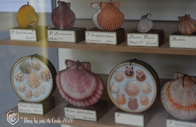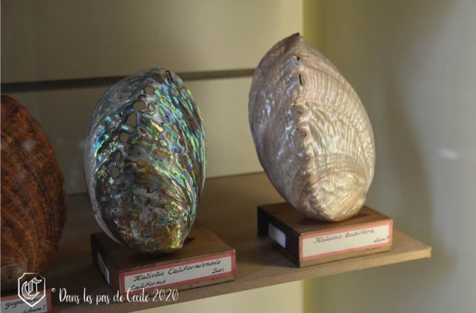 La pièce suivante présente la collection de coquillages, composée de pas de 40 000 pièces ! Trois ensembles sont visibles : les conus, les pectens (plus connus sous le nom de coquille Saint-Jacques) et les haliotis (surnommée « oreille de la mer » de par sa forme). Passionnée par les sciences naturelles et une envie de partage des connaissances, Henri Dupuis, présente certains coquillages coupés, pour que l’on puisse apercevoir la composition interne au mollusque, et si cela est possible il le dessine lorsque celui-ci est vivant.