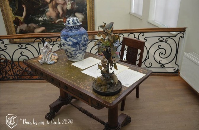 Sur le palier de l’escalier d’honneur a été installé son bureau avec plusieurs objets reflétant les thèmes de ses collections, les sciences naturelles avec la composition à l’oiseau ou encore les céramiques avec le vase ou encore ce petit objet insolite pour les générations d’aujourd’hui qui n’est autre qu’un porte montre !