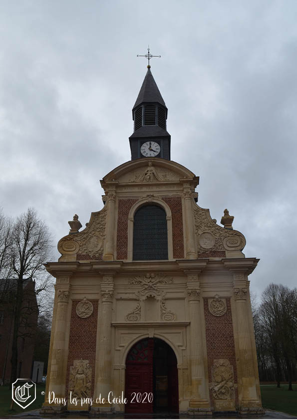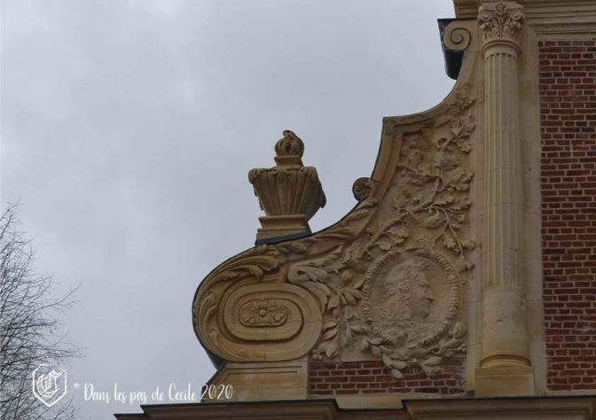 Quand le visiteur se trouve face à cette chapelle, il pense probablement aux points communs avec l’architecture baroque des deux places en centre-ville. Eh bien, oui la chapelle est aussi classée dans l’architecture baroque. Les volutes sur le fronton, le mélange de la brique et de la pierre calcaire. Ici, il faut également y ajouter des décors faisant référence au roi avec les médaillons, ou encore à la fonction du site avec des sculptures représentant des armes et des éléments d’armure.