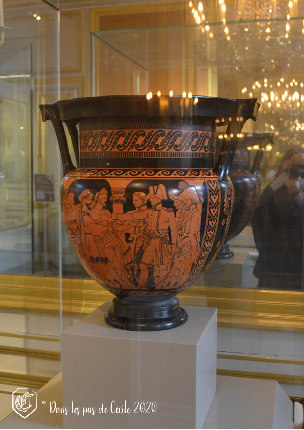 …. Napoléon qui se fait représenter comme lors de l’époque antique ! Habituellement, sur ce type de vase noir à figure rouge, on y retrouve les dieux, des scènes de mythologie…