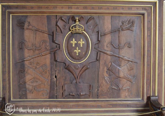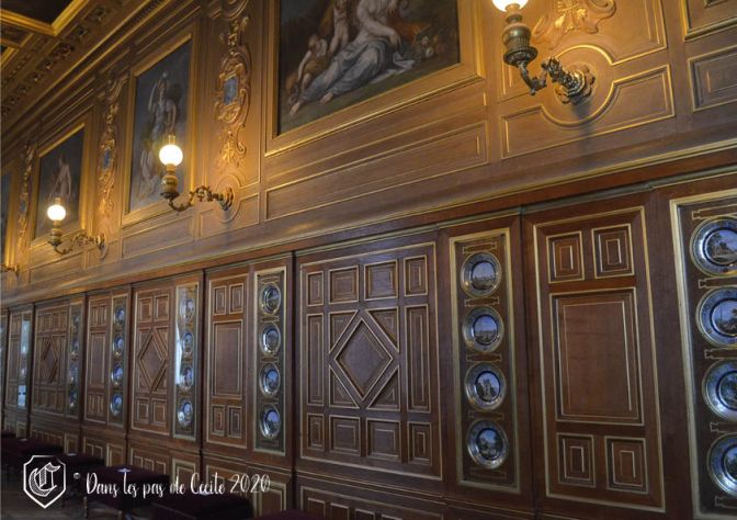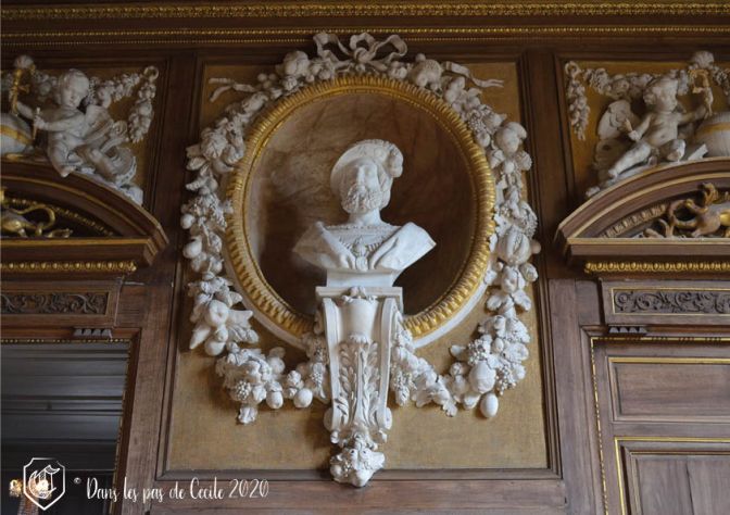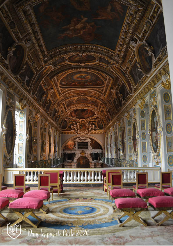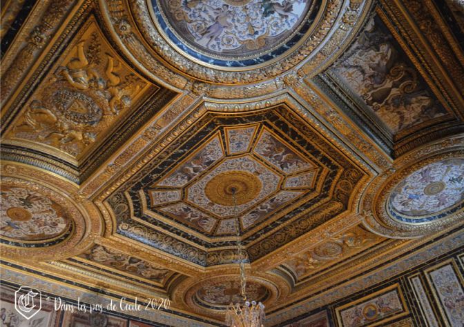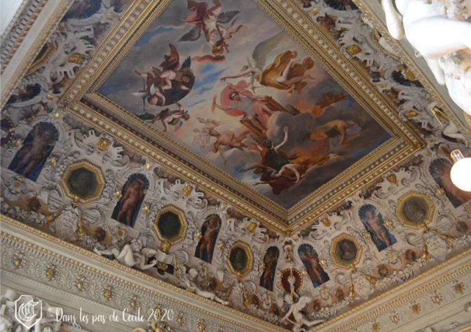 La chambre à coucher suivante est celle d’Anne d’Autriche. Attention, l’Histoire avance et recule avec les différentes pièces, attention à ne pas s’emmêler les pinceaux (la guide d’Elicec va s’amuser à préparer la visite et ne pas peindre les futurs visiteurs de ses visites ☹). Le décor est réalisé par des artistes de l’époque, Charles Errard et Gilbert de Sève, qui vont ont en charge le plafond et ses lambris pour le premier, et les dessus de porte pour le deuxième. Celui-ci va notamment représenter Anne d’Autriche et sa bru Marie-Thérèse d’Espagne sous les traits de Minerve et de l’allégorie de l’Abondance.