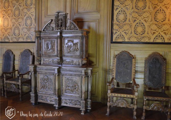 Continuons la visite, en revenant à nouveau sur nos pas, mais cette fois-ci afin d’emprunter l’escalier et découvrir les appartements du rez-de-chaussée. Tout d’abord, passage dans les deux salons de Saint-Louis, richement décorés, avec une sculpture qui attire l’œil d’Elicec car celle-ci est un peu particulière, nous vous laissons découvrir la photo…