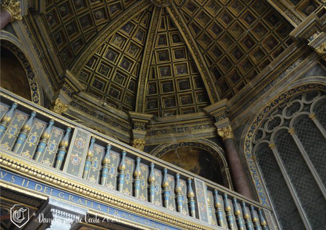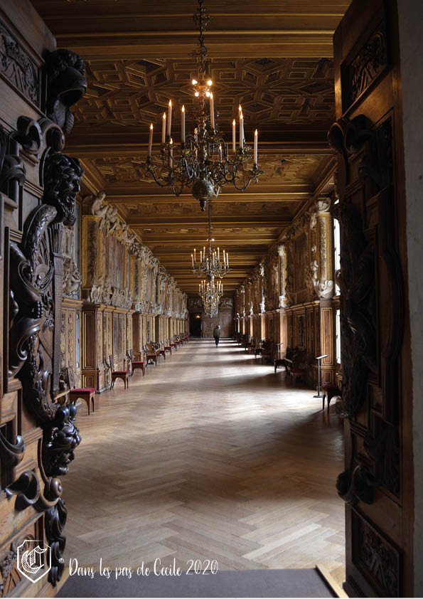 … pour arriver dans le vestibule de la Chapelle ! Premier aperçu car il faudra attendre encore un moment pour pouvoir accéder à celle-ci par l’entrée. Mais d’ici, il y a déjà la possibilité d’admirer le plafond peint, de loin, car impossible de dépasser les portes en chêne à l’entrée. Pour pouvoir se situer dans le château. Ce vestibule se trouve juste au niveau de l’élément incontournable du château et qui permet de le reconnaître : l’escalier en fer à cheval. D’ici également, Elicec a accès à la galerie qui est également connu dans le château : la galerie François Ier 😊 Etant donné la période, celle-ci est vide et permet ainsi d’en profiter de manière exclusive.