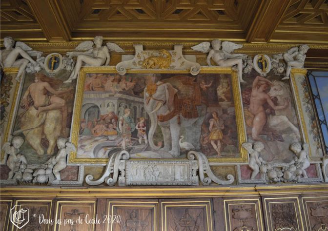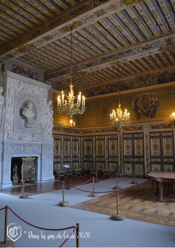 Retour sur nos pas pour revenir dans la salle des gardes afin de partir vers l’autre partie de l’aile du bâtiment et d’arriver notamment dans la splendide salle de bal décorée là encore par Primatice, avec des scènes mythologies. Cette salle de bal est commencée sous François Ier mais sera achevée sous le règne de son fils Henri II, elle aura pour fonction principale d’accueillir les bals (comme son nom l’indique !) mais aussi les réceptions et les banquets. Le roi et la reine sont installées sur l’estrade, dos à la cheminée, pour assister aux festivités et face aux musiciens qui se trouvent dans la tribune au-dessus de l’entrée. Cette pièce sera délaissée jusqu’à la Révolution et servira notamment de salle de gardes. Elle sera ensuite restaurée par Louis-Philippe avec le parquet qui reprend les motifs du plafond (invisible pour l’œil du visiteur car sous une moquette…)