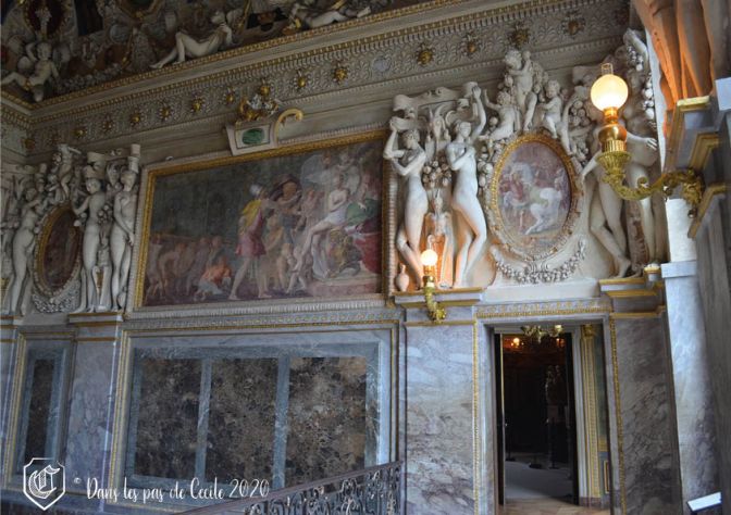 Et surtout direction vers l’unique pièce que la guide conférencière d’Elicec connaissait avant d’entrer le château, car étudié pendant ses études universitaires : la chambre de la duchesse d’Etampes, qui n’est autre que l’une des favorites du roi François Ier ! C’est une chambre décorée par l’artiste italien Primatice, où s’allie harmonieusement les fresques et les stucs évoquant l’histoire d’Alexandre le Grand. Drôle de sujet pour décorer une chambre féminine selon Elicec, mais bon les goûts et les couleurs … Aujourd’hui point de mobilier lié à l’activité du sommeil mais un escalier, qui a été percé et aménagé par Louis XV.