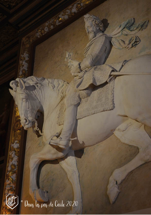 … une sculpture qui semble être en même temps peinture car elle est installée dans un cadre. Il s’agit ainsi d’un grand bas-relief représentant Henri IV à cheval. La partie du château abritant ces deux salons est la plus ancienne parce qu’il s’agit de l’ancien donjon du château, seule élément médiéval parvenu jusqu’à nos jours !