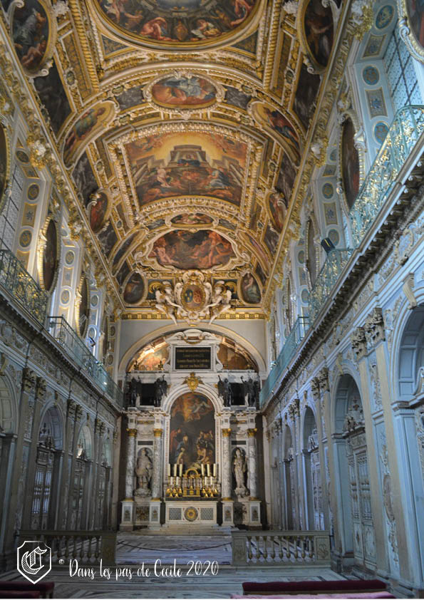 Il s’agit d’une chapelle à deux niveaux, permettant ainsi au roi et à la reine d’assister aux offices depuis la tribune, les princesses étant sur les balcons et le rez-de-chaussée étant quant à lui réservé aux courtisans. Les peintures de la voûte représentent le Rédemption de l’Homme.