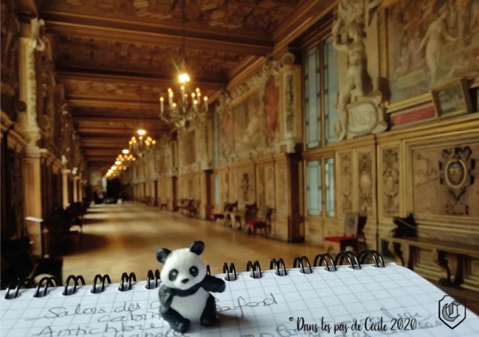 L’une des premières salles qui intriguent Elicec est celle qui est nommée la Galerie aux assiettes. Elle porte ce nom dû aux assiettes qui sont encastrées dans les boiseries. Elles représentent des événements ayant eu lieu à Fontainebleau, la forêt, d’autres maisons royales mais également les lieux de visites à l’étranger de Louis-Philippe. Pourquoi ceux de Louis-Philippe et pas un autre souverain ? Parce que c’est lui qui a aménagé cette galerie vers 1840. 😊