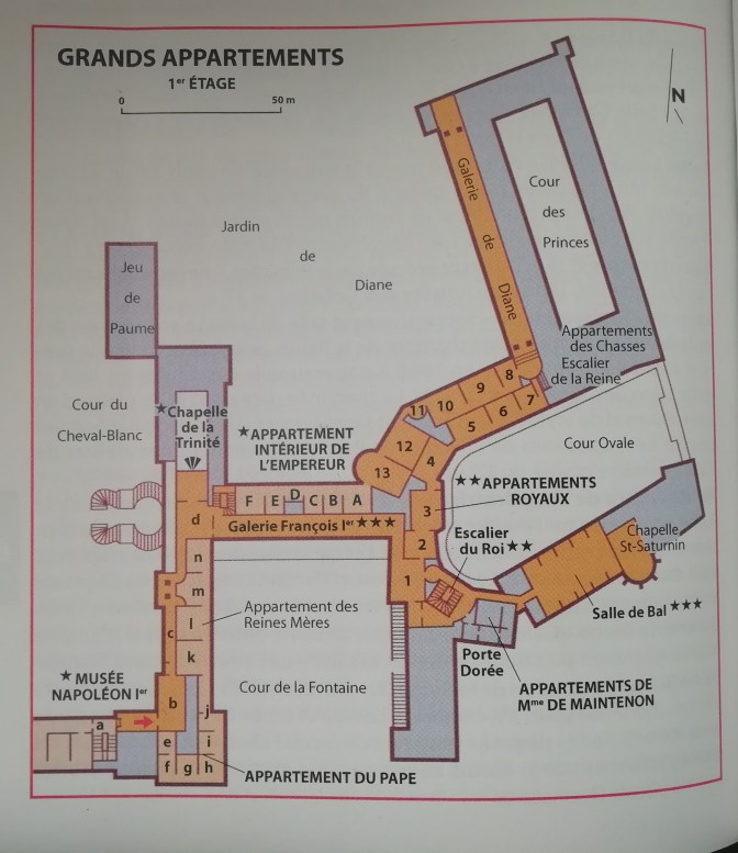 Au bout de la galerie François Ier, nous sommes au niveau de la partie en demi-cercle constituant les différentes parties du château sur le plan et Elicec se dirige dans un premier temps dans la partie gauche de l’aile entourant la Cour ovale, avec la salle des gardes.