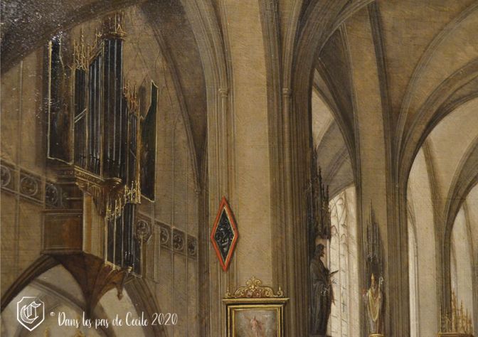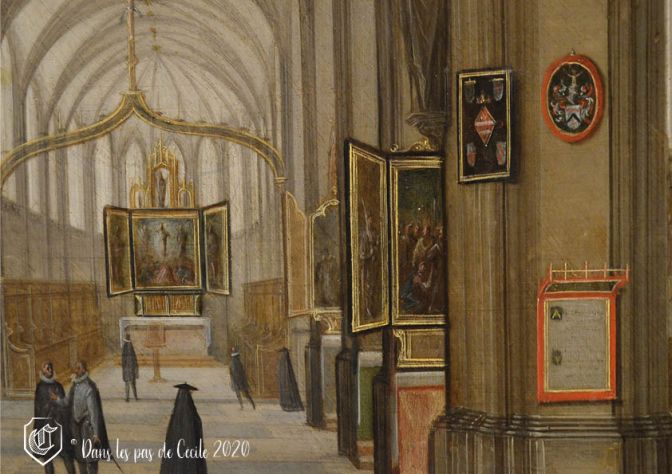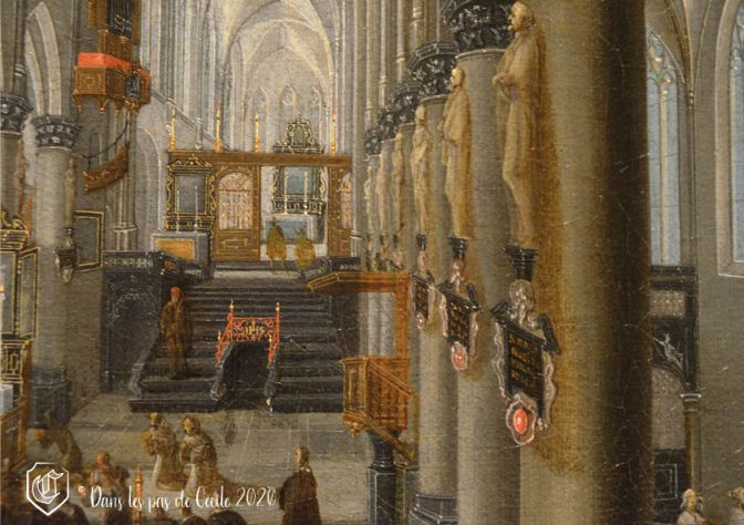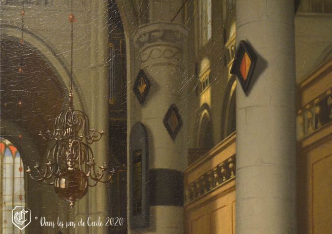 Les artistes hollandais vont également changer de point du vue pour leurs œuvres. Quand les flamands se placent dans le narthex (espace juste avant le début de la nef) pour embrasser la totalité de la nef, les hollandais vont parfois se placer dans les bas-côtés ou dans le transept, offrant ainsi des perspectives et des constructions différentes agréables pour l’œil. Notez également une présence beaucoup plus régulière des obiit, blason funéraire représentant le blason de la famille. Cela permet, entre autre, de faire perdurer le souvenir des personnes disparues.