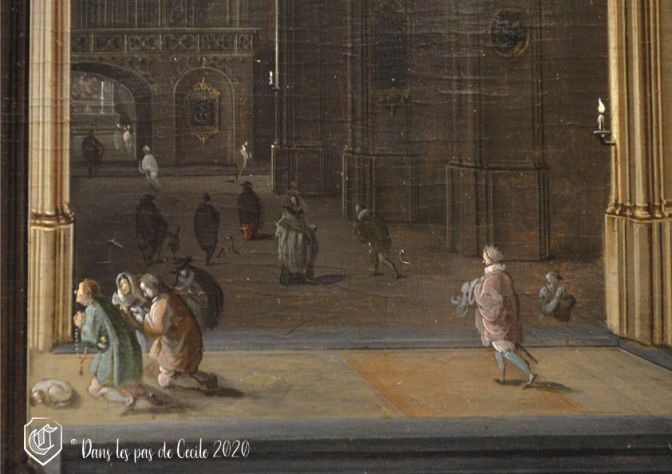 Ce qui est remarquable dans les tableaux présentés, c’est notamment l’attention portée à l’architecture de précision. En effet, les artistes construisent les œuvres pour l’œil de l’admirateur. Une vue générale de la nef du bâtiment permet un voyage visuel le long des colonnes, de traverser l’espace sacré et pourtant de s’arrêter à différents endroits pour observer un tableau, un obiit, une scène de la vie quotidienne qui, pour certaines, obéissent à des règles sociales et/ou religieuses, comme la cérémonie des relevailles que l’on aperçoit sur les photos du tableau qui suit. Il s’agit d’une cérémonie mise en place 40 jours après l’accouchement. Pendant cette période, la jeune maman est considérée comme impure et est interdite d’église, le baptême est ainsi réalisé sans sa présence afin de permettre au nouveau-né d’intégrer le monde chrétien. La cérémonie permet à la maman de réintégrer l’église. Cela est visible sur le tableau avec le cortège de femmes au premier plan. La maman est reconnaissable car en tête du groupe et portant un tissu rouge dans les mains. Les femmes l’accompagnant sont celles qui ont été auprès d’elle pendant cette période de 40 jours. Le prêtre recouvrait la tête de la jeune femme avec son étole, lui offrait la communion puis l’aspergeait d’eau bénite pour la purifier.