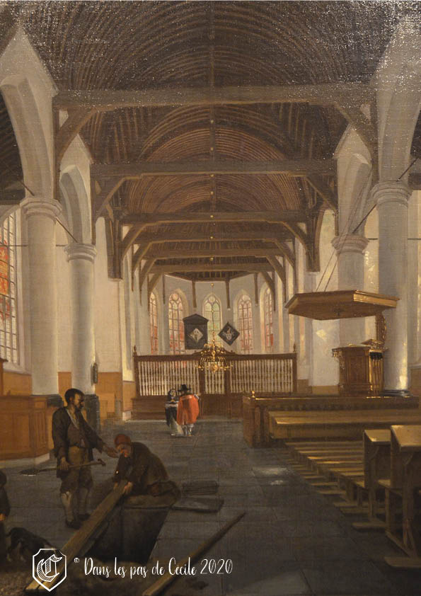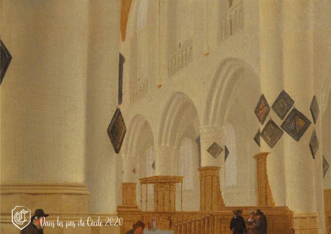 La deuxième partie de l’exposition met à l’honneur la peinture hollandaise, qui peut paraître plus austère mais il n’en est rien ! Les œuvres sont aussi éblouissantes que les intérieurs d’églises catholiques. Cela permet également de comprendre des aspects des cérémonies protestantes, comme l’importance de la chaire lors des prêches. Auparavant dans les bas-côtés, elle est désormais un élément central, les fidèles sont debout et autour de celle-ci, et non plus assis.