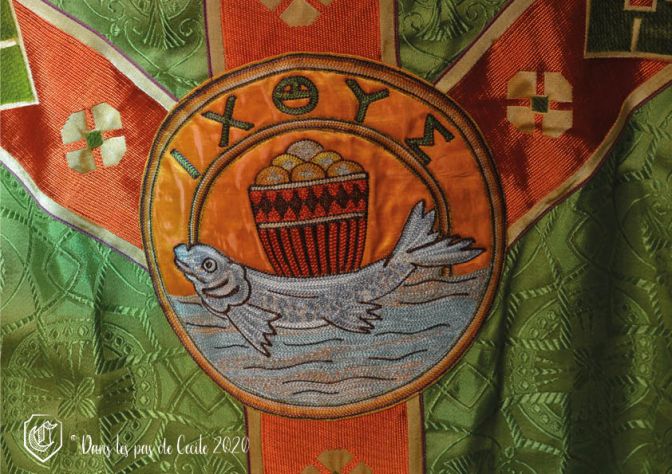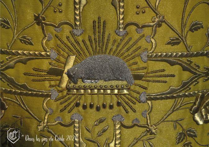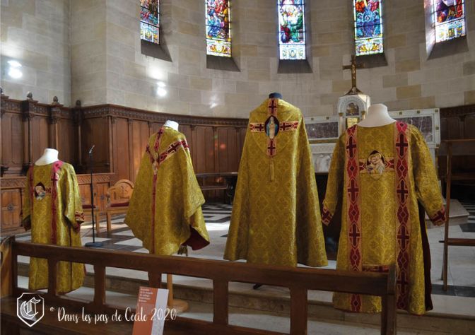 Pour terminer l’exposition, une partie est consacrée à la symbolique des motifs présents sur les différentes parties des vêtements liturgiques. Sachant que tous ces motifs ne doivent absolument rien au hasard et dont la référence est plus ou moins explicite pour les fidèles.