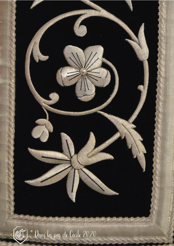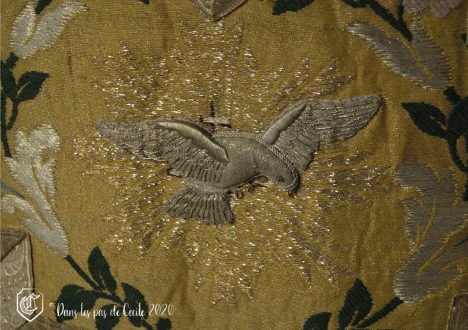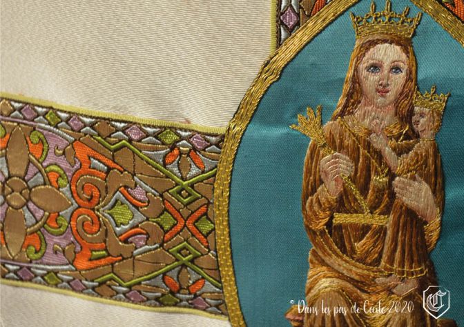 Chaque présentation de symboles est aussi l’occasion d’évoquer les différents savoir-faire comme le tissu damassé (tissu façonné de telle manière qu’il y a un aspect mat et un autre brillant), la broderie Cornely (broderie mécanique permettant le point de chaînette et le point de bouclette), la passementerie, ici représentée avec Notre-Dame des Miracles de Saint-Omer ! (ouvrages réalisés avec des fils d’or, d’argent, de soie ou de métal