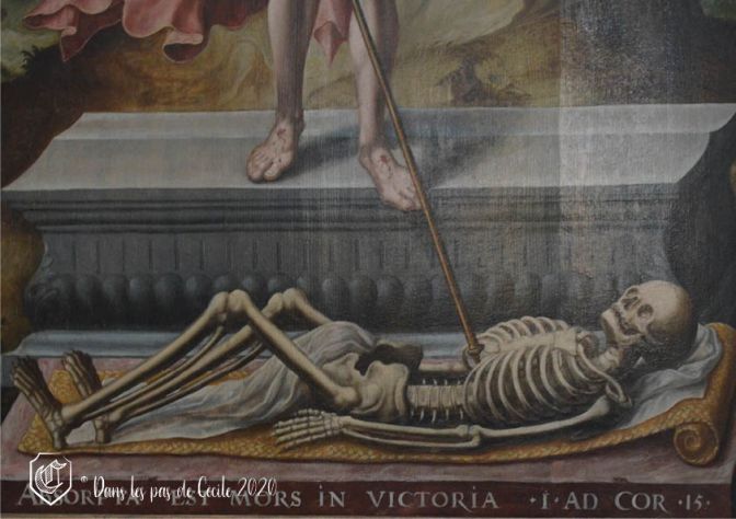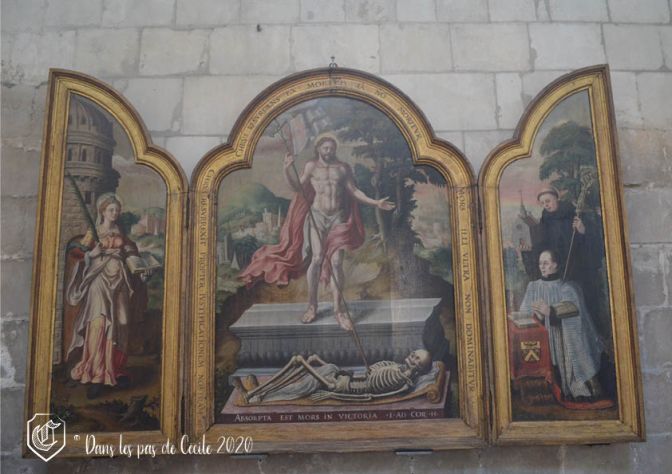 Reste à évoquer le coup de cœur de la visite pour Elicec et sa guide, le triptyque de la résurrection du Christ triomphant, qui se trouve comme vous l’avez désormais compris sur le panneau central, avec sur les panneaux latéraux le commanditaire (le chanoine Robert de Saint-Martin) et Sainte Barbe.