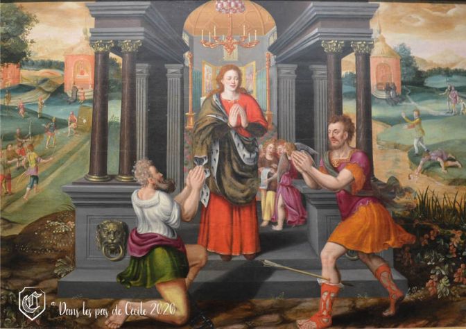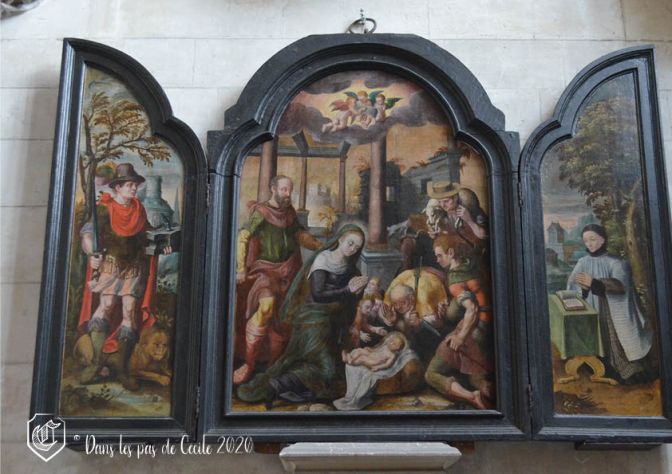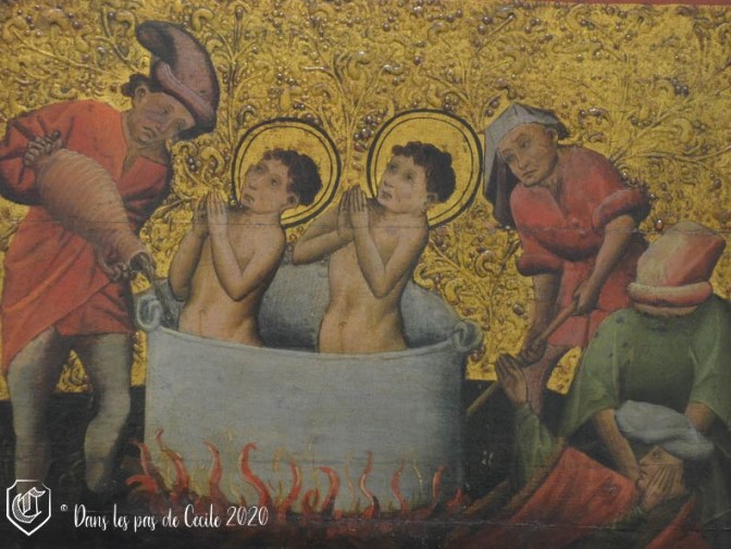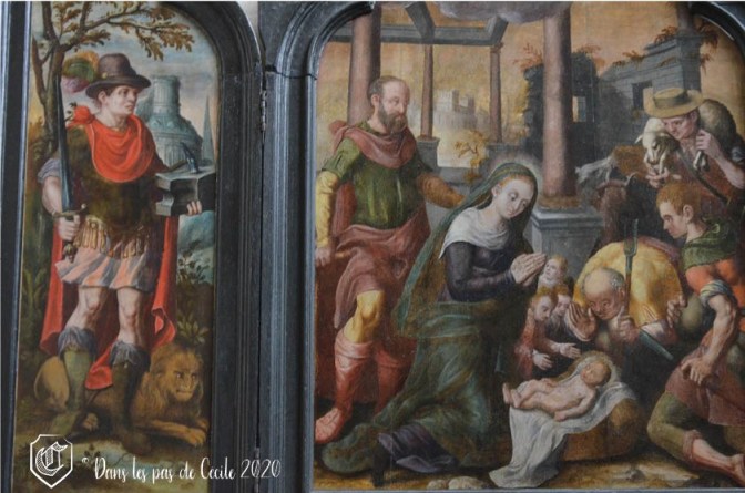 Nous voici arrivées devant un triptyque (fixe) relatant l’histoire de saint Crépin et saint Crépinien. Il suffit de regarder les différentes scènes pour savoir comment ils ont fini ! Les épisodes du martyre se trouvent sur les côtés, représentant les parties latérales du format, sauf qu’ici il n’y a pas de charnières pour refermer les panneaux.