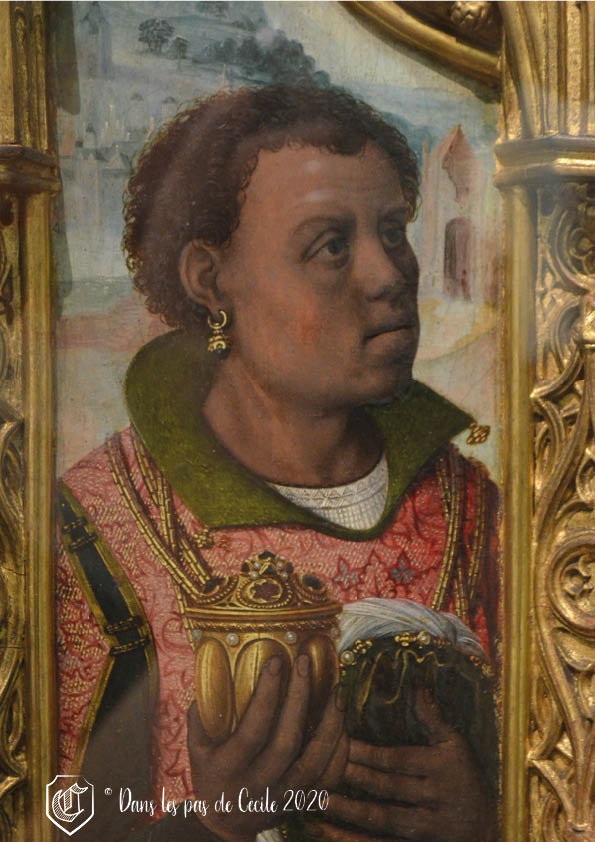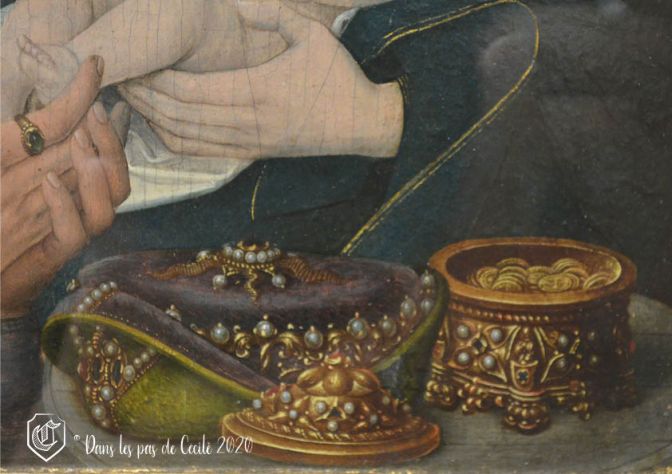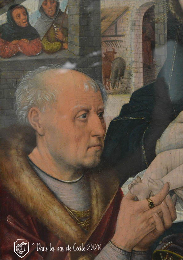 Ainsi, ici au centre, nous retrouvons Marie et Jésus, accompagné d’un des trois Rois mages, Melchior, le plus âgé des trois. D’ailleurs, sur ce retable, une question se pose à propos de Melchior : serait-il représenté sous les traits du commanditaire ? Pourquoi, une telle question ? Parce que le portrait de celui-ci est très bien réalisé, d’une très grande finesse, ce qui est souvent le cas pour les portraits des personnes que l’on peut identifier, car il y a la possibilité de faire poser la personne. Mais c’est également les vêtements portés : un tissu plus léger et doublé d’hermine.
