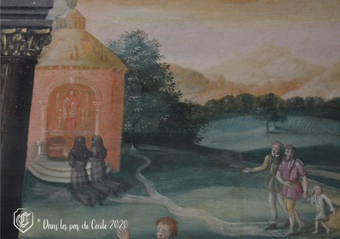 Le détail sur lequel la collègue a attiré l’attention concerne la petite chapelle en haut à droite du tableau avec les deux personnages agenouillés. Il s’agit probablement de sœurs religieuses. Mais le détail intéressant est la manière dont elles ont été réalisées…