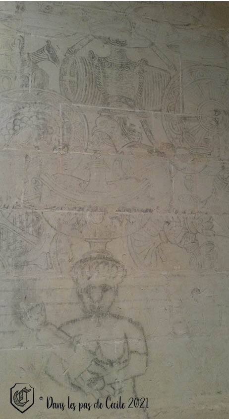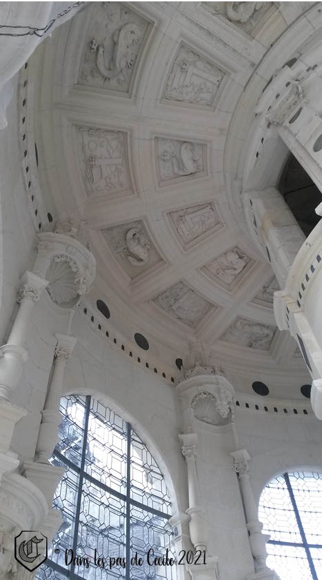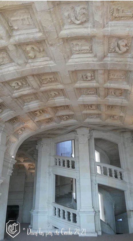 En reprenant l’escalier pour descendre, ne pas oublier de lever la tête pour admirer les décors présents dans cette partie de l’escalier. Peut être que lors de votre visite vous l’avez remarqué, mais l’escalier à double-révolution est le seul élément d’architecture concentrant les éléments décoratifs. Son objectif, attirer l’œil et impressionner celui qui le regarde ! 😉