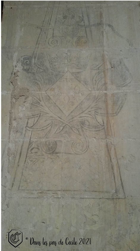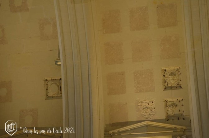 La suite de la visite se poursuit par l’accès à l’aile gauche du château abritant la chapelle au premier étage. Pour y accéder, le visiteur emprunte le petit escalier à vis, puis le balcon extérieur avant de longer le couloir menant à la chapelle proprement dite ! Ce balcon extérieur avait une utilité particulière, cela n’était pas juste pour profiter du soleil, mais surtout parce que tout le monde ne pouvait pas emprunter le même chemin que le roi (étiquette oblige !) Une chapelle avec un plafond qui n’est pas terminé, en ce qui concerne le décor. Certains médaillons ont été sculptés, mais pas tous, vous reconnaîtrez le soleil de Louis XIV parmi eux 😊.
