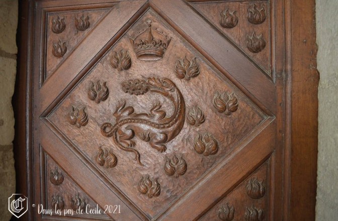 Dans les quartiers du donjon ont été ajoutés des explications sur l’organisation des pièces composant un quartier (4 par étages, nichés entre 2 bras de croix et le tout se reproduisant à tous les étages du donjon). Le quartier est vide de son mobilier, cela peut sembler étrange mais en même temps peut permettre de se faire une idée de ce à quoi ressemble le château lorsqu’il n’est pas habité. Pour la fonction des pièces, elles reprennent en globalité l’agencement de ce qui a été vu dans le logis du roi (exception faite de l’oratoire). C’est par la même occasion d’admirer les portes de bois sculptées de salamandre, emblème de François Ier.