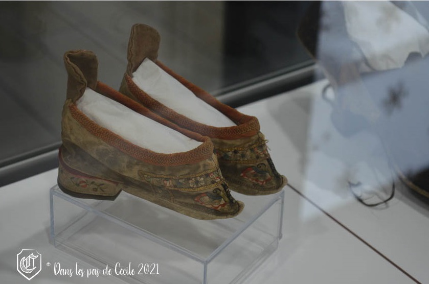 La deuxième paire étant celle portées par les femmes en Chine lorsque la mode des pieds bandés était présente. Mode qui consiste à bander les pieds dès le plus jeune âge, car avoir un petit pied était considéré comme un signe de richesse. Ainsi, avec les bandages, cela évite la croissance du pied et les déformer afin de ne pas dépasser les dix centimètres.