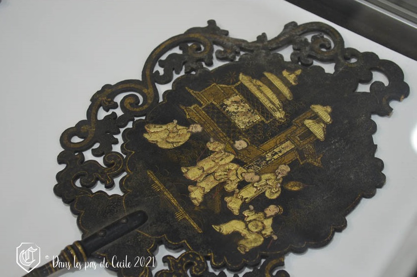 Deux très beaux éventails chinois sont aussi présentés et permettent de mettre en valeur la technique de la laque.