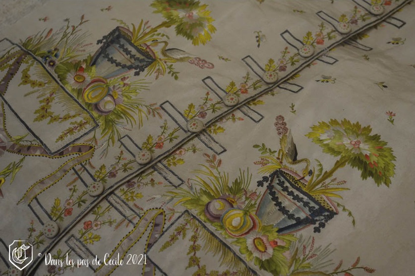Dans l’exposition, un gilet d’homme est ainsi exposé pour montrer cette évolution vestimentaire masculine. Il s’agit d’un gilet porté sous la veste pendant le 18e siècle. Ces gilets sont toujours réalisés dans des teintes claires rehaussés de motifs évoluant en fonction des goûts : floral sous Louis XIV, ou le goût du voyage au 18e siècle par exemple.