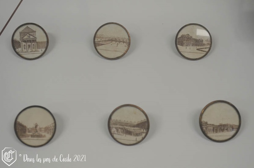 Les boutons sont encore une fois présents pour orner le vêtement, le mettre en valeur. Les boutons exposés dans la vitrine sont divers (garde nationale, district de Calais) mais une série a particulièrement attiré le regard d’Elicec et de sa guide-conférencière : les six boutons représentant des paysages urbains.