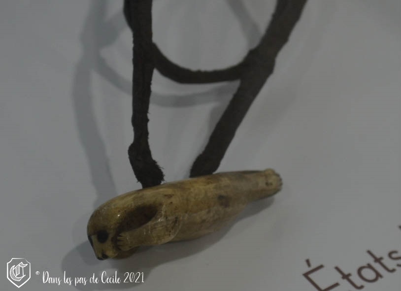 Terminons avec le phoque en pendentif. Le phoque est réalisé dans de l’ivoire et serait d’origine Inupiaq (au nord du détroit du Béring en Alaska).&