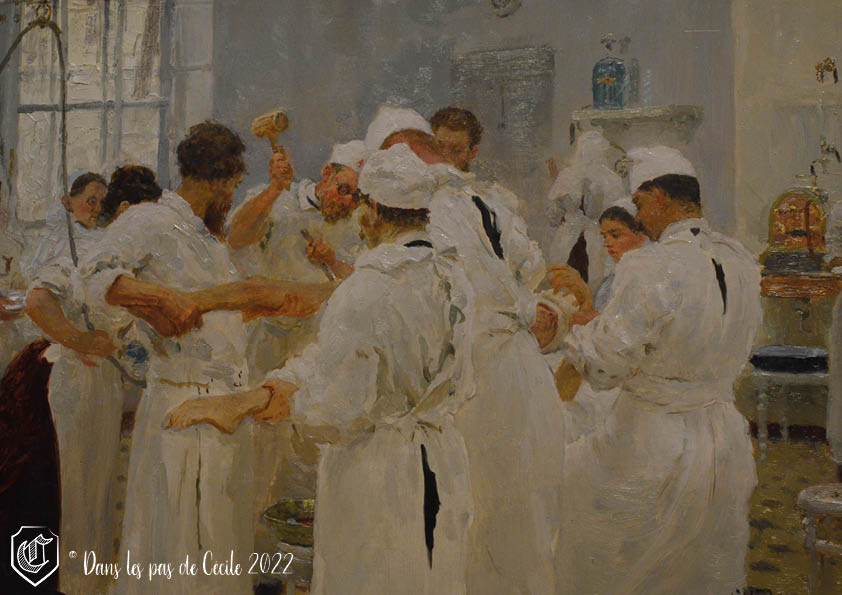 Cette scène de chirurgie représente Evguény Pavlov en pleine opération. Il est enseignant et chirurgien à la cour impériale, sera nommé médecin-chef de l’ordre des Sœurs de la Croix-Rouge à Saint-Pétersbourg en 1883.