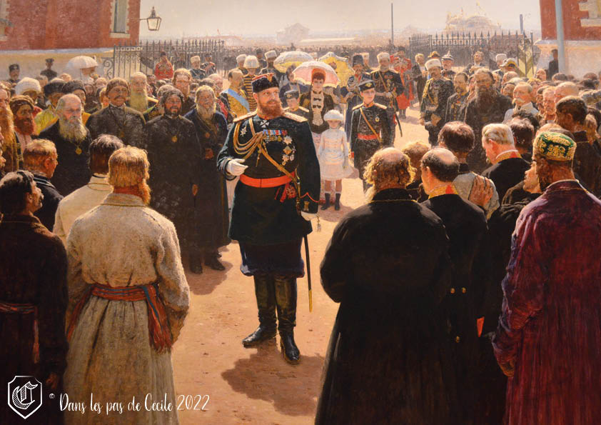 Mais au tournant du siècle, le régime tsariste connaît des difficultés à contenir les révoltes ainsi qu’à proposer des réformes. C’est à ce moment-là que Répine répondra à une commande de la couronne pour mettre en avant le « gouvernement éclairé » de Nicolas II avec un portrait grand format.