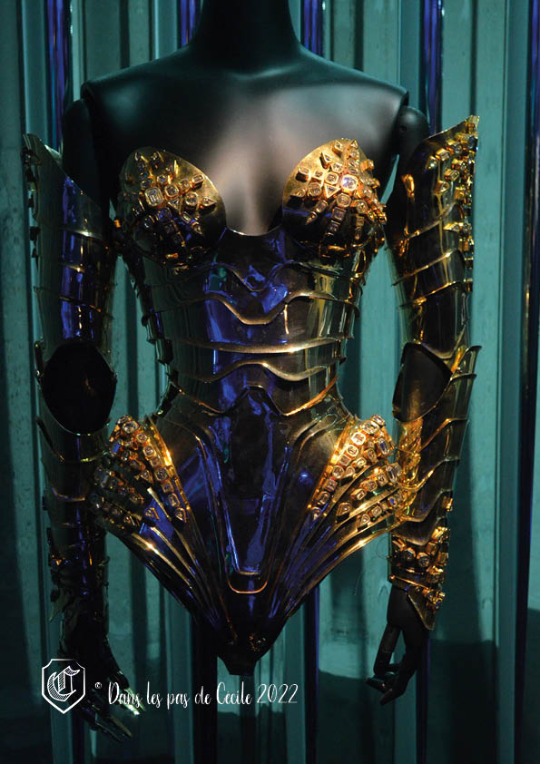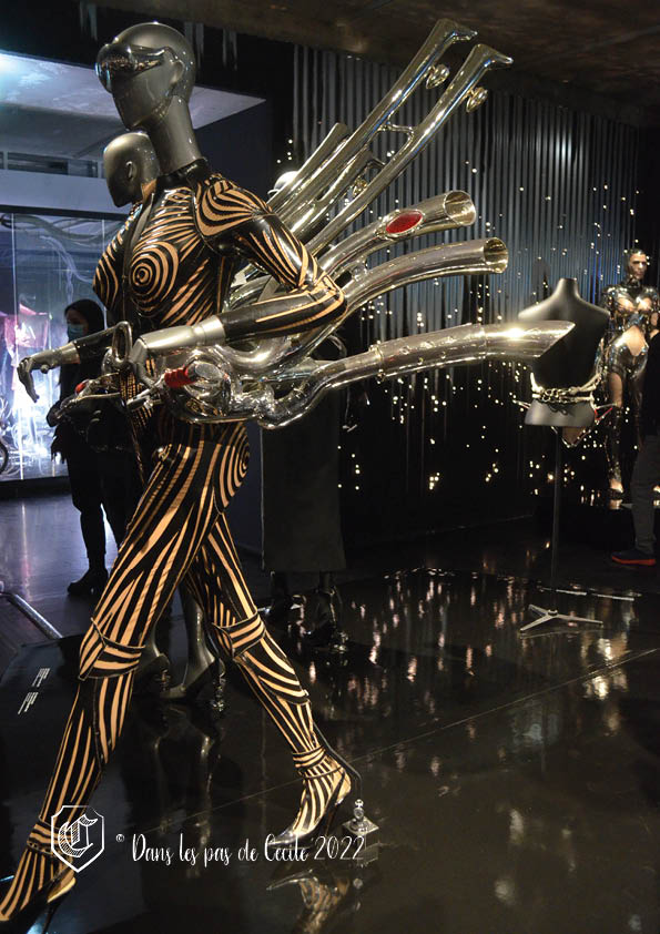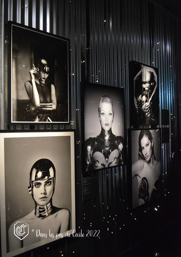 Thierry Mugler, c’est aussi un univers futuriste, mis en lumière dans l’exposition avec ses créations ainsi que les photographies mode avec des célébrités qui ont été habillés par le couturier.
