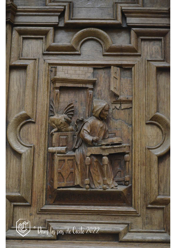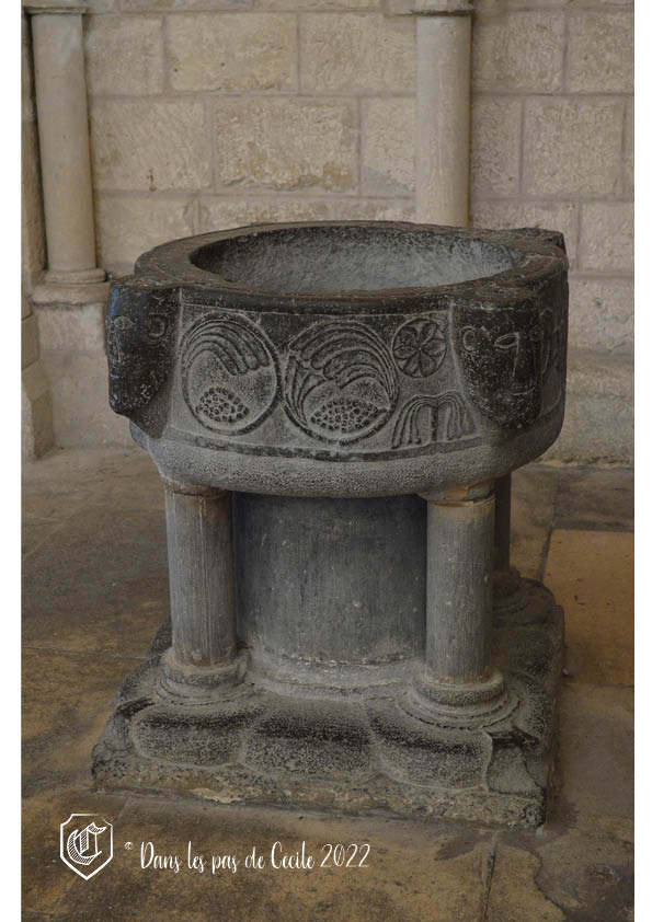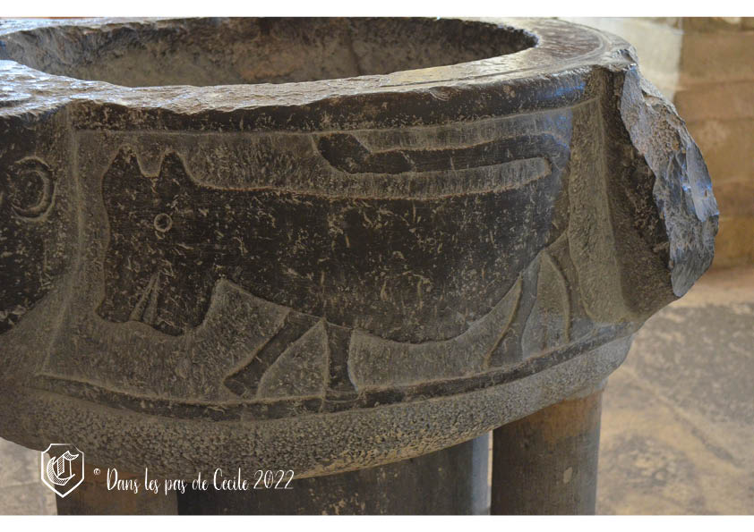 Une pièce de mobilier qui nous a particulièrement plu sont les fonds baptismaux romans. En pierre de Tournai et sculpté sur les quatre faces avec : un chien, un oiseau, un griffon et un dragon. On y retrouve des symboles de vie opposés aux vices et vertus. Les quatre têtes en haut relief représentent les quatre fleuves du Paradis qui sont : le Tigre, l’Euphrate, le Géon et le Phison.