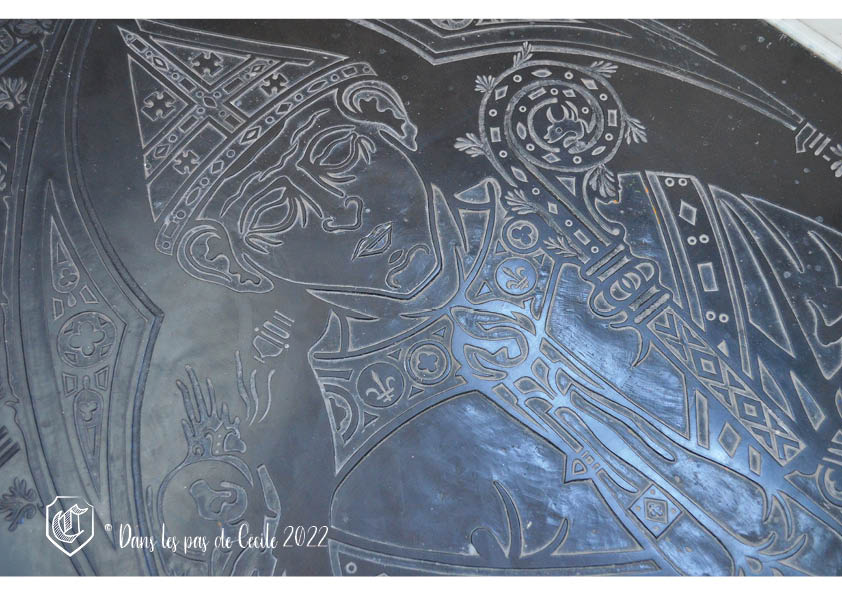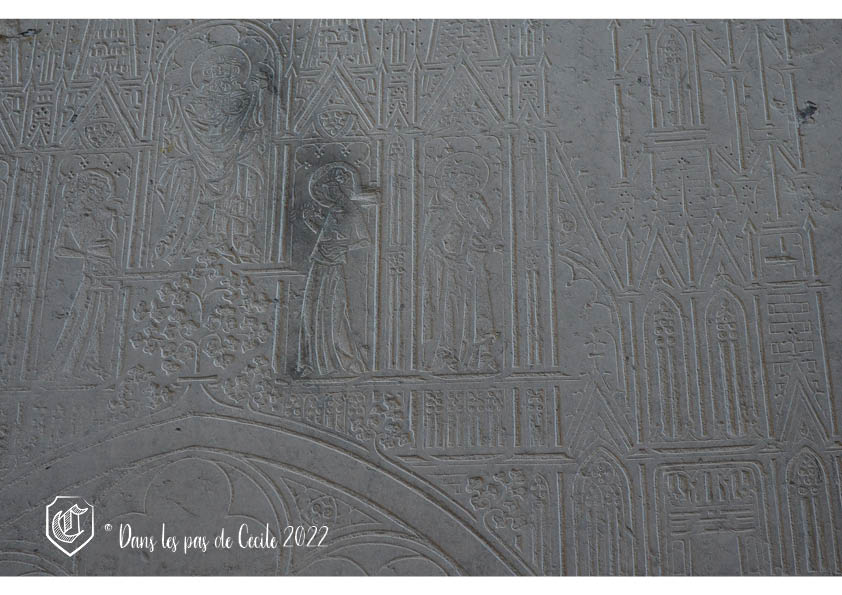 La cathédrale de Laon voit son sol composé de 200 dalles funéraires ! Elles se concentrent dans la nef et le transept. Il était de coutume pour les personnes riches ou les religieux de se faire enterrer dans les édifices religieux. A Laon, il s’agit pour la majorité de dalles représentant les chanoines. Être le plus près possible du chœur permettait, selon les dires, d’arriver au Paradis plus rapidement. Elles sont réalisées soit en calcaire de Senlis ou en pierre de Tournai, ce qui donne ces aspects de dalles noires et blanches avec un relief de gravure très peu marqué. Une partie d’entre elles ont été relevées et sont conservées dans les chapelles latérales. Dans la nef est également visible le cénotaphe (monument funéraire vide) de l’évêque Barthélémy de Joux qui a joué un grand rôle dans la construction du monument.