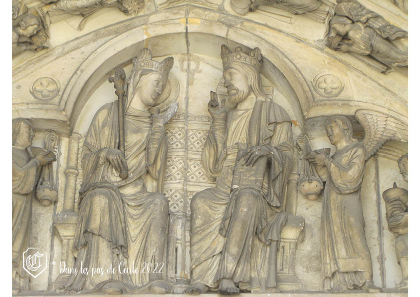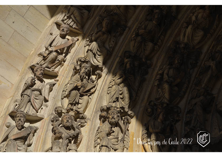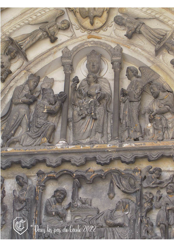 Les thèmes des portails sont liés au Christ et à Marie. Le portail de droite est dédié au Jugement Dernier (qui est d’ailleurs le plus ancien des trois, avec un style se situant entre la période romane et le style des années 1200). On y retrouve le Christ entouré des apôtres avec sous leurs pieds les morts qui sortent précipitamment de leurs tombes. Nous y retrouvons également la séparation entre les élus et les damnés, visible avec le sujet des Vierges sages et Vierges folles (il s’agit d’une parabole mettant en avant l’appel du Christ à suivre les principes de la fidélité à sa parole, la miséricorde et la charité pour gagner le Paradis après la mort). Le portail de gauche est quant à lui inspiré du portail de sainte-Anne que l’on retrouve à Notre-Dame de Paris et qui servira par la suite pour celui à Chartres. C’est Marie qui est mise à l’honneur en position frontale, avec le Christ et les Rois mages sur le côté. Le reste du portail reprend trois épisodes que sont l’Annonciation, la Nativité et l’Annonce aux bergers. Nous pouvons y retrouver le combat entre les vices et les vertus ou les ancêtres de la Vierge dans les différents étages de voussures (superposition d’arcs brisés au-dessus du tympan sculpté) entourant la scène centrale. Terminons par le portail central qui est similaire à celui de la cathédrale de Senlis avec une représentation du Christ et de sa mère qui se font face, assis et entourés d’nages. Encore une fois, la vie de Marie est mise en avant avec les décors présents : ses ancêtres, sa mort et son assomption (montée au ciel).