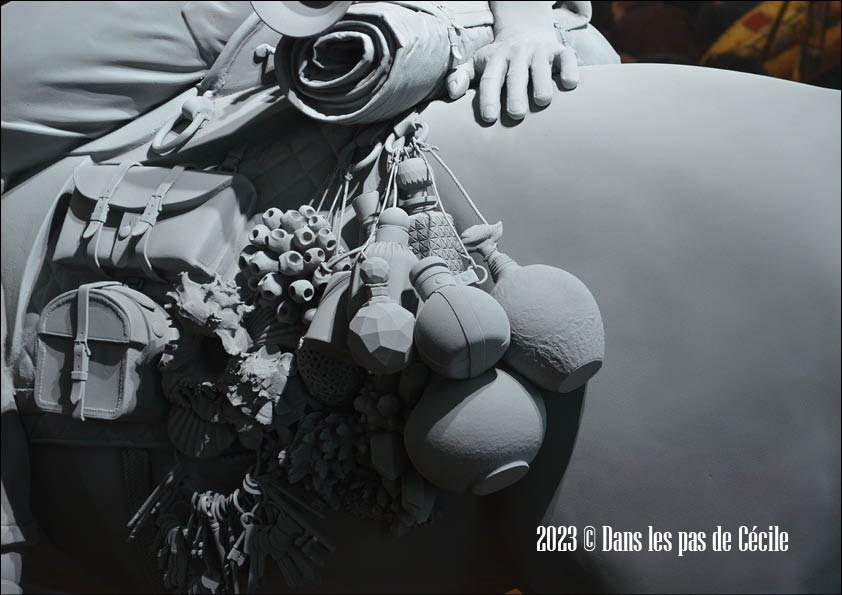 Horseman est une autre œuvre incroyable. L’homme a les yeux ouverts et nous invite à regarder dans la même direction que lui. Mais en même temps, le visiteur va avoir les yeux qui s’accrochent sur les différents objets ornant la selle : trousseau de clés, des flacons, des coquillages, des boules de Noël. Tous ces objets peuvent faire référence à des rituels qui rythment notre vie quotidienne, ou des moments de l’année. Sommes-nous réellement maîtres de nos vies ou sommes nous soumis aux rituels de la société, qui nous donnent un cadre, une sureté ?