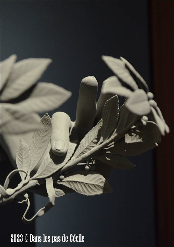 Et terminons par l’œuvre qui me plait le plus dans cette exposition : Gesture. Cette paire de bras sortant du mur et tenant une couronne de laurier. Il s’agit d’une série qui reprend des gestes du quotidien comme le fait de faire une bulle de savon, de pouvoir avoir un oiseau qui se pose sur notre bras. Excepté pour celle exposée, parce que nous sommes d’accord, nous ne coiffons pas tous les jours une couronne de laurier 😉
