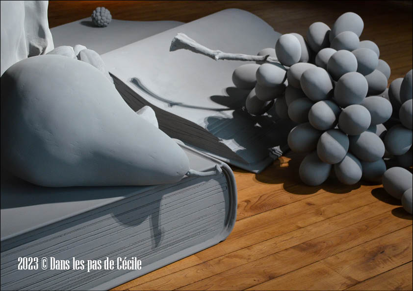 Chaque objet représenté dans une nature morte, ou vanité, possède une symbolique qui lui est propre. Si nous revenons à la sculpture, le livre correspond à la connaissance, le papillon à l’élévation de l’âme, la chandelle au passage du temps …